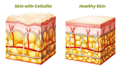 Cellulite is thought to arise when the fibrous bands of connective tissue (fascia) that anchor the skin to muscles break down, allowing fat cells to push up into the skin layer. This creates the uneven, bumpy texture that gives cellulite its cottage cheese-like appearance.